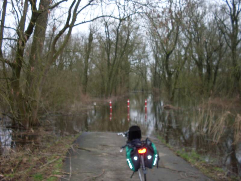 Het moest er toch een keer van komen. De eerste fietstocht met de nieuwe ligfiets. Vooral het starten en optrekken was lastig met dat ding. Eerst maar richting Lemelerveld om daar de eerste keer te stoppen voor een foto. Aan de brugleuning vasthouden om weer weg te komen. De bedoeling was om langs het Overijssels kanaal naar Raalte te gaan, maar ik zat aan de verkeerde kant van het kanaal. Dus ging het via Heino die kant op, ook leuk! In Raalte moest ik verschillende keren oversteken of linksaf slaan. Elk paaltje brugleuning of zelf een trekhaak van een shovel diende zich als houvast om goed mee te kunnen starten. Daarna even zoeken in Wijhe, en ik kwam al vlug op de juiste weg in Fortmond terecht. Helaas kwam ik niet al te ver want de hele straat was wegens het hoge IJsselwater helemaal ondergelopen. Aangezien ik mijn duikbril niet bij mij had ben ik teruggegaan. Dit keer via Den Nul, naar Broekland, achterlangs en binnendoor terug naar Raalte. Vanaf daar ben ik via de tunnel in Mariënheem de klinkerweg richting Hellendoorn gegaan. Daar was een plekje “kuj mooi zitt’n” waar ik ondanks het weer prima was om even te gaan zitten. Na een bak koffie kwam er een hele vriendelijke hond erbij zitten, na afscheid van het leuke gezelschap ging het de Hellendoornse Berg over naar het thuisfront. Totaal 80 km gehad, maar ik was doodop na de nieuwe ervaring.