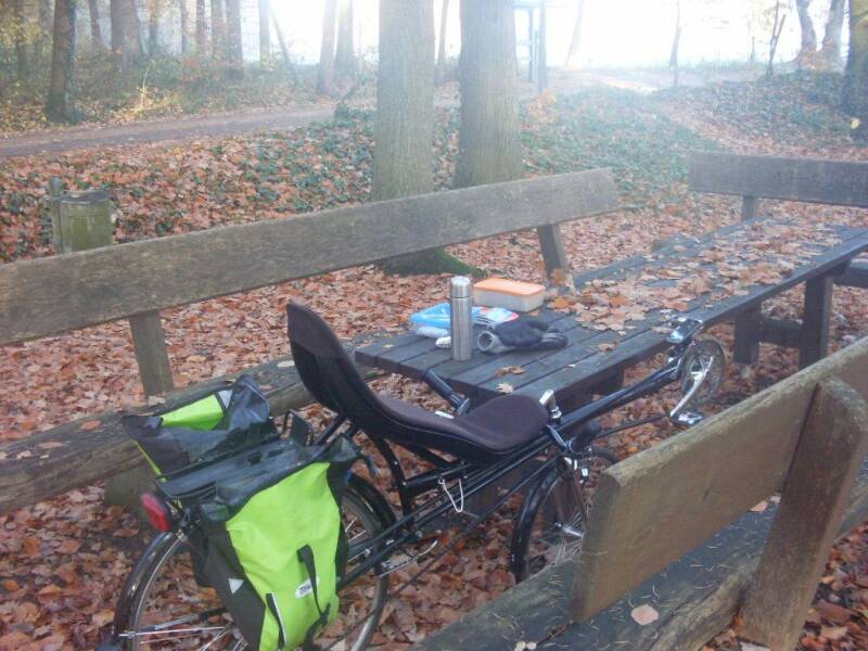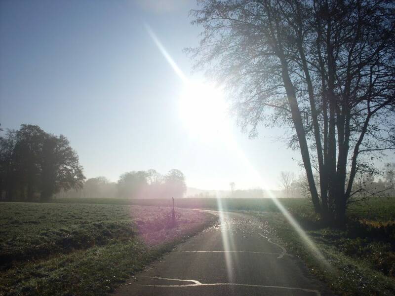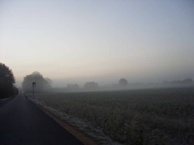 Omdat het zo laat licht wordt maar een uur later weggegaan. Tegen 2 uur koers op Almelo, Hengelo Enschede om bij Glanerbrug de grens over te gaan. Tot ik mij bij een pauze bedacht dat het lampje niet al te fel meer was. Na 83 keer proberen, en de laatste keer het blikje iets te verbuigen had ik eindelijk weer een goede voorlamp. Daarna ging het verder de duisternis via Gronau naar Ochtrup. Daar wist ik een fietspad naar Wettringen. Alleen was dit gedeelte pikkedonker, en mistig, en daardoor een bijzondere ervaring. Zodoende kwam ik al verder oostwaarts en begon me de hemel steeds langzamer lichter te worden. Er leek geen einde aan de schemering te komen. In de contreien van Emsdetten was het gelukkig licht genoeg om van de hoofdwegen af te gaan en de fietspaadjes te nemen.