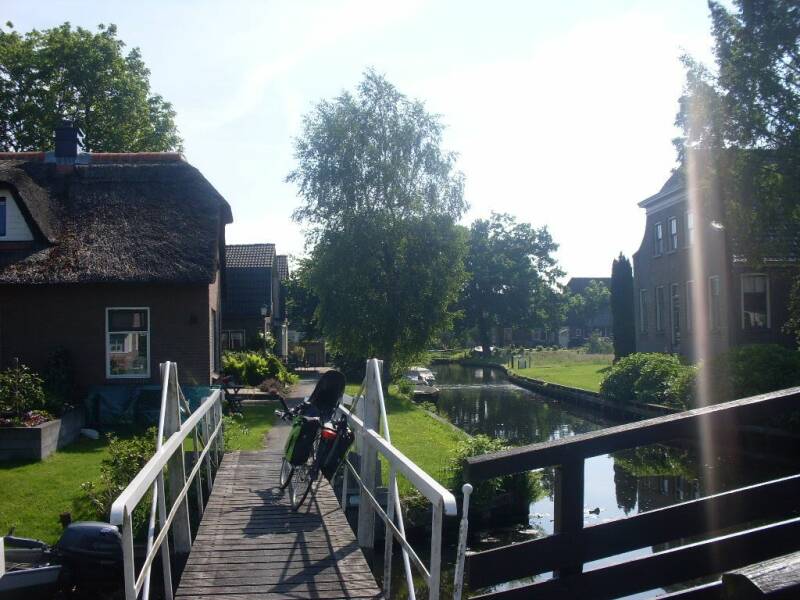 Daarna naderde ik al vlug een leeg Giethoorn, wat ik heb ik daar genoten! Geen ziel te bekennen. Alle bruggetjes en paadjes voor mij alleen! Ik heb er zelfs even op een bankje gezeten om het op me in te laten werken. Natuurlijk, ik ben er wel vaker geweest, maar toen was het niet zo leeg. Daarna de noordzijde nog gedaan, de korte broek aangedaan, en ben ik verder gefietst naar Dwarsgracht. En eigenlijk is het daar nét zo mooi als in Giethoorn. Ik kwam daar aan de praat met een man die zijn hond lekker liet zwemmen. Hij kon zich opwinden over de mensen die met elektrische fietsen vol gas rondfietsen, goed moeten uitkijken voor de bruggetjes en zo vergeten om zich heen te kijken, terwijl het daar zo uniek en mooi is. De bedoeling was om de pont bij Jonen over te gaan, maar daar moest ik anderhalf uur op wachten...