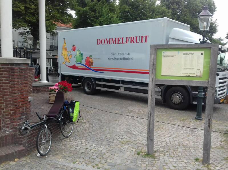 In sint Oedenrode ben ik even op de Brink gaan zitten. Na de treinreis ben ik namelijk gelijk gaan fietsen, en was ik inmiddels wel toe aan wat eten. Terwijl ik daar zo zit, komt er een paar wielrenners van leeftijd uit nieuwsgierigheid naar mijn fiets bij me staan praten. Wat ik ging doen, en of dat wel ging, de afstanden, aardige jongens. Op de markt nog een paar banaantjes gekocht, en verder ging het weer.