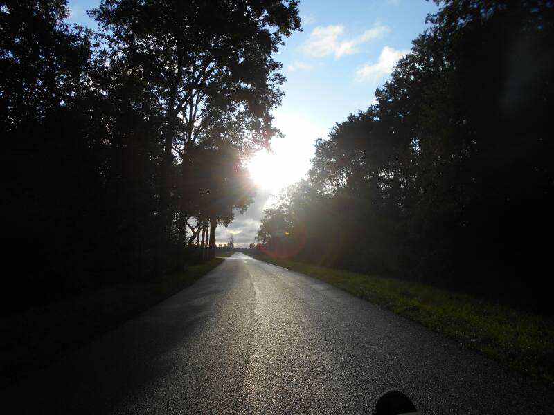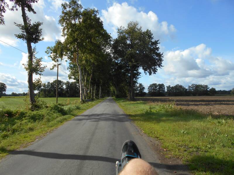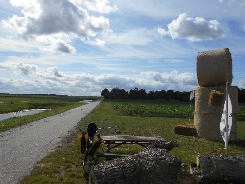 In Emmen kwam ik terecht op een of ander parcours, dus ben ik zonder publiek of applaus een finish overgegaan. Ik had de rit ook nog niet klaar, dus en terecht! Na Emmen nog een bui in het bos richting Valthe, en daarna Valthermond. Dat hebben ze gebouwd om het geduld te testen van Twentse ligfietsers, want het dorp kwam geen eind aan. Leuk dat ik nog terecht kwam in een dorp bij een school, net op het moment dat de ouders hun kroost daarheen brengen. Vele kinderhanden vragend wezen wat dat voor gekke fiets was. Bij Musselkanaal rechtsaf, ik voelde inmiddels dat de wind in mijn rug bleef waaien en kwamen na flinke afwisselingen in bos en boerenland er gehuchten en buurtschappen waar ik nog nooit van had gehoord: Sellingerbeetse, Jipsingboertange en bij een tankstation in Jipsinghuizen heb ik mijn water aan kunnen vullen.