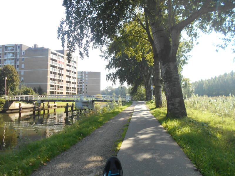 Van de oude stadsmuren is de foto niet mooi gelukt. Hier fiets ik langs het 'andere' uiterste van het Zwolsekanaal. Thuis ligt zo'n 40 km verderop, een goeie steenworp van het water.