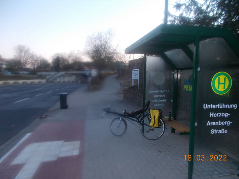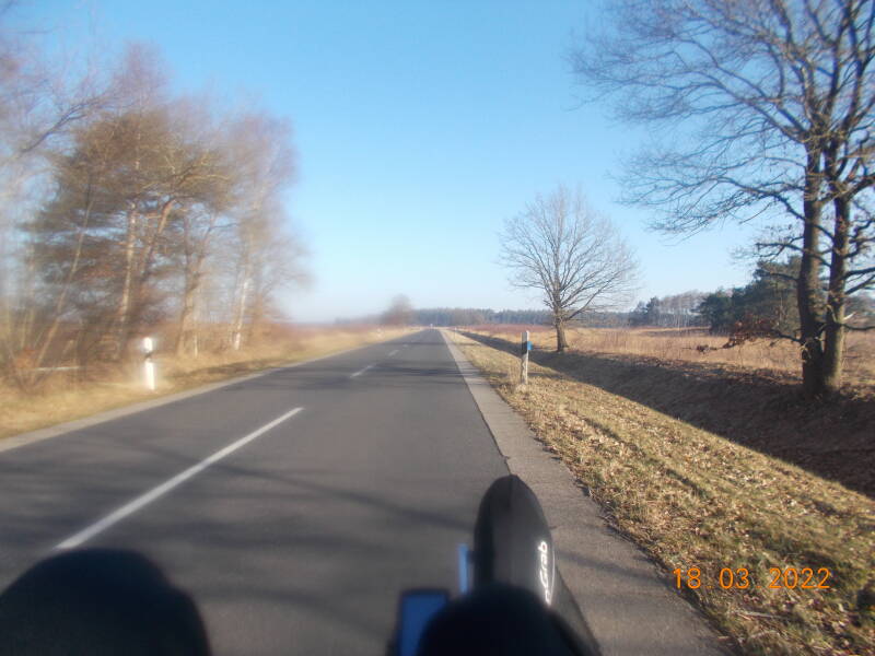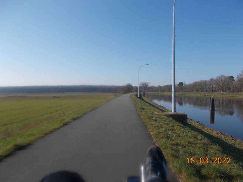 In Duitsland zie je weinig fietsers, veel minder als hier. Je ziet enkel wat forensen naar fabrieken die langs de route staan. Eenmaal voorbij centrum Meppen tijd voor eerste pauze om half 7 in een bushokje. Natuurlijk is de zon is net op, het koudste moment van de dag. Niet te lang blijven hangen dus. Voorbij het tankstation linksaf de Schlagbrückenerweg op. Een 15 kilometer lange weg, dwars over een militair terrein met vliegveld vola Waarschuwingsborden, alarmbellen, slagbomen en camera's. Aangezien ik twijfelde of ik er wel langs kon heb ik afgelopen week zelfs gebeld naar een bedrijfsnummer op googlemaps om te vragen of het wel kon. Of het geen problemen opleverde met de fiets. Vrijdags en weekend werd er niet geschoten en kon je er langs bleek. Een mooie weg, maar geen fietspad, de paar auto's die er waren zoevden dus met 100 langs me heen. De alternatieve route 6 km verderop, maar dat was een veel drukkere weg met ook veel vrachtverkeer. Ook geen trek in dus.