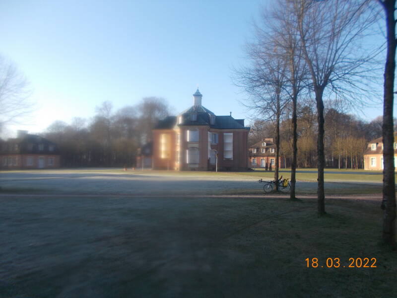De plaatselijke jeugd die naar school liep moest bulderend lachen om een Tukker op een ligfiets, en ik maar denken dat Duitsers geen humor hadden. Schloss Clementswerth was zo gevonden. Foto, rondje en ik had het wel gezien. Vooral vanuit de lucht ziet het er mooi uit: