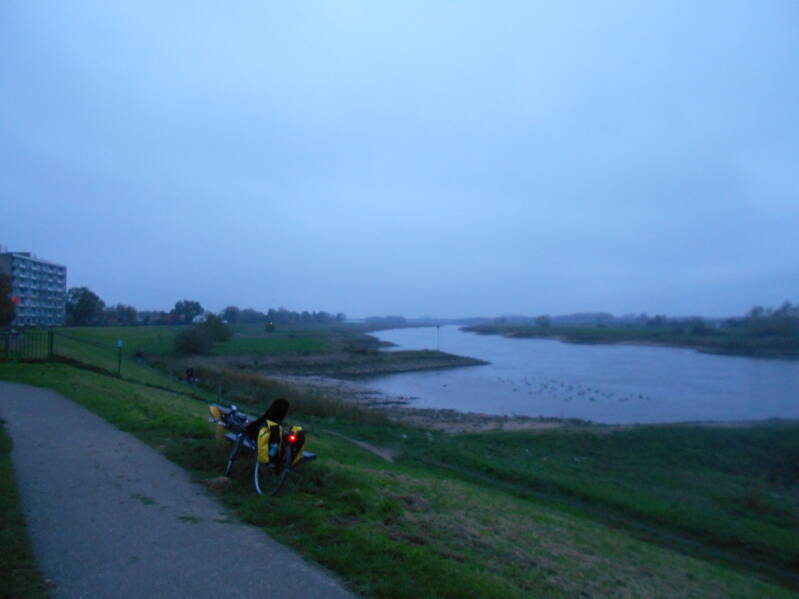 Even raakte ik verstrikt in de spits bij Zutphen toen het schemeren klaar was. De mooie gebouwen in centrum maken altijd indruk op me. Even later fiets ik lang de IJssel. Dit fietspad is niet druk. Wel langs de provinciale weg richting Baak. Meeste schoollui die eenmaal achter me opmerkingen over mijn fiets maken. Vlug kon ik rechts, blij om de drukke weg om te ruilen voor een dijk naar Bronkhorst. Ik ben hier eerder geweest, maar dat is een decennium geleden.
