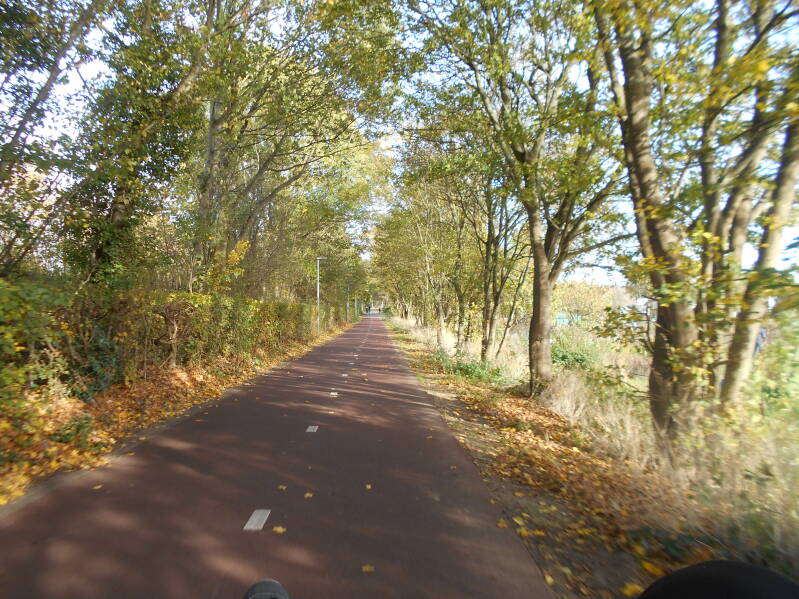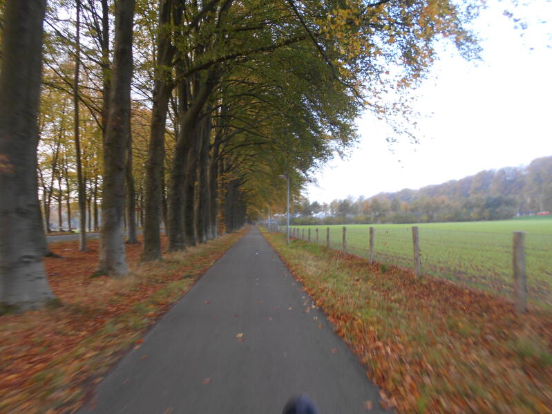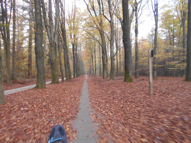Eenmaal rechts bleek de beklimming te zijn naar de Posbank. Met haarspeldbochten naar boven takkelen. Natuurpark Veluwezoom. Daarna terug naar noorden weer richting de route naar Loenen. Fietspaden van hoogstens 30 cm breed . De rest lag bezaaid met blaadjes. Vooral afdalen in de bochten was het goed opletten geblazen. Even verder weer het fietspad dicht. Daar gok ik meestal niet op omdat ik geen mountainbike bij me heb. Dan maar via Laag Soeren en Eerbeek. Tijd voor pauze op een bankje die niet lekker zat. Maar ik vind het ook leuk om in een kern van bebouwde kom ergens te zitten waar veel mensen langskomen. Eenmaal het water aangevuld bij de bakker, waar het bankje bij stond,, staan lui nieuwsgierig bij mijn fiets te kijken. Terwijl ik al pratend het kastje weer instel om de route op te pakken, schuift er cm voor cm een oud vrouwtje in een rolstoel langs me heen. Haar leeftijd was ten minste 3 cijfer als ik het zo inschat. Toen ik ernaar vroeg bleek ze naar de bakker te willen. Met de verhoging zou ze dat zelf voor sluitingstijd niet halen vreesde ik. Dus: ,,mag ik?", en ze zat even later met rolstoel waar ze wilde zijn en ik vroeg een potige meneer of hij haar nadien even wilde helpen.