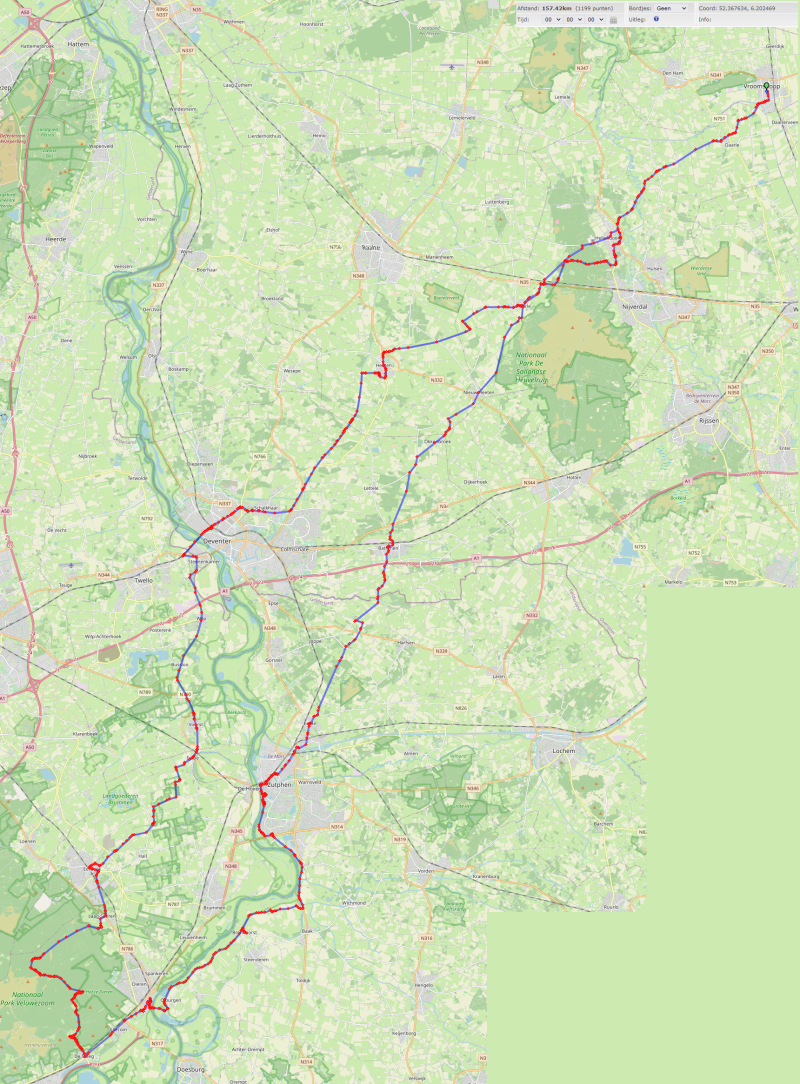 Hoor de wind waait door de bomen dacht in bed rond half 2, nadat ik wakker werd van de wekker. Normaal waait het 's nachts niet. En de geplande 110 km tegen de wind in puffen vond ik niet erg aantrekkelijk. Zelfs niet met een ligfiets. Ik geloof dat ik de laatste ritten verwend ben met de wind ‘s nachts. Gelukkig heb ik meerdere routes klaar staan op mijnroute.nl. Ik had de wens eens langs de IJssel bij Zutphen af te zakken naar Bronkhorst en dan via Veluwe terug. Dus kon ik nog 2 uur slapen, en heb tijdens ontbijt met koffie de route alsnog op kastje gezet.