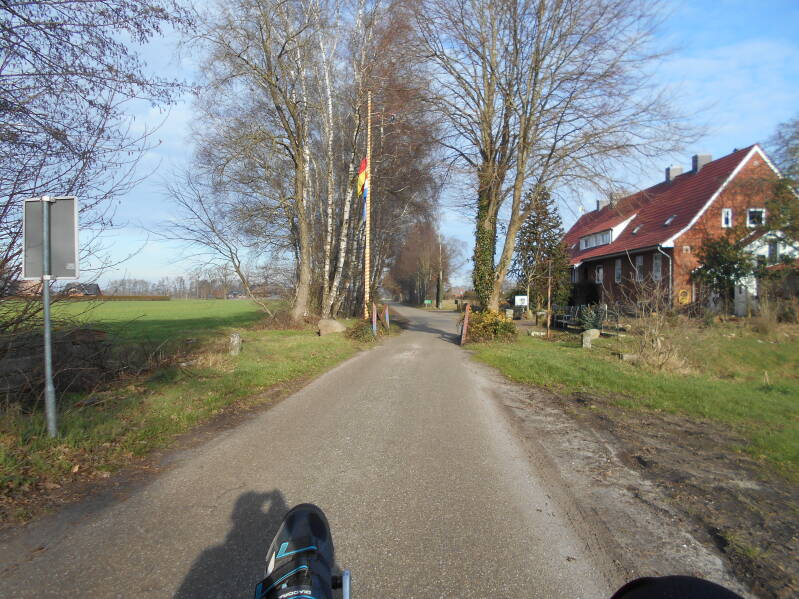 Ik merkte dat de vogeltjes alweer aan het fluiten waren. Hoewel het nog best kan vriezen in de winter, vind ik altijd al een mooi uitkijken naar het voorjaar. In Geesteren heb ik de keuze gemaakt richting Manderveen te gaan. Het hele jaar 2023 ben ik nog niet in Duitsland geweest. En er miste nog een grensovergang in mijn lijstje. Die tussen Manderveen en Egge. Enkel een mast met 2 vlaggen, en een versmalling en dat was het dan. Behalve dat je nu fietsers ziet met helm verandert er verder weinig.