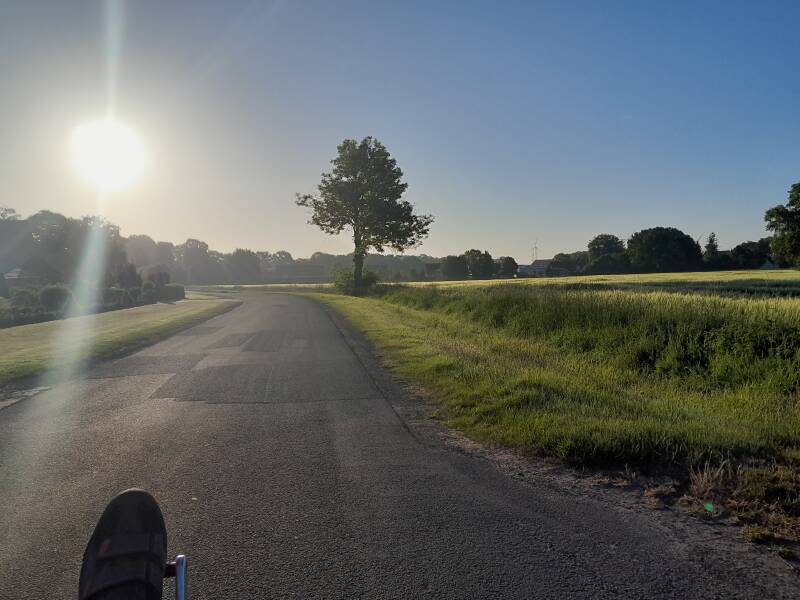 De zon komt net boven. Ik geniet volop. Het gebeurt dagelijks, maar het blijft het mooist om mee te maken als je naar het oosten fietst. Na Halverde volg ik witte wegen. Lekker rustig zonder auto’s. Ik rij de eerste grote stad binnen. Bramsche. Ik had ingeschat om hier 8 uur ongeveer ongeveer te zijn, maar stond al een uur eerder voor het spoor te wachten. Naast me staan een paar jongens enthousiast praten over hun weekendplannen.