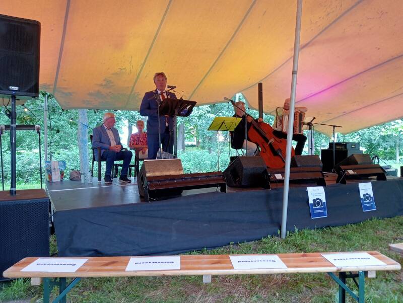 Ik rij het terrein op van Schuilenburg, word nog bijna tegengehouden dat fietsers verboden zijn, maar kan de ligger toch meenemen. De toespraak heb ik gemist, maar wel even leuk dat de nadruk kwam te liggen op het thuisvoelen in de gemeente. Dat is me in de anderhalf jaar tijd dat ik woon inmiddels ook zelf gelukt. Een gemeenteraadslid vroeg nog naar mijn afkomst en fiets, ik heb maar niet verteld hoe zo’n omweg ik gehad heb. Toen er camera’s en microfoons van Rtvoost in de buurt kwamen ben ik hem vlug gesmeerd. Misschien dat ik volgend jaar eens weer ga kijken met iets minder kilometers in de benen.
