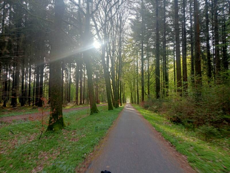 Ik sla linksaf. Hijkerveld in. Kanaalrijden kan ik thuis ook. Ik heb mezelf getrakteerd op zoveel mogelijk fietspaadjes door bos of heidegebied, ook hier rijp met een opkomende zon erbij. Ik sta even de omgeving in me op te nemen. Ik geniet ondanks de vorst aan de grond.