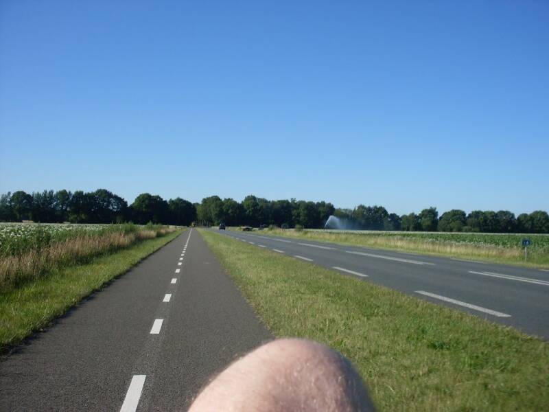 Vanmorgen met het krieken van de dag rond een uur of 4 vertrokken, het begon net met schemeren. Prachtige kleurenpalet in de lucht waarin de zon begon door te komen.Eerst een hindernis bij de nieuwe tunnel bij Hardenberg (die dus toch nog afgesloten was), 2 km omrijden... Ik ben zo vrij geweest de hekken te openen en te voet naar de andere kant van de N34 te raken. Daarna was het weer een hele belevenis door Slagharen te komen. De eerste welverdiende pauze met koffie was voorbij Tiendeveen.