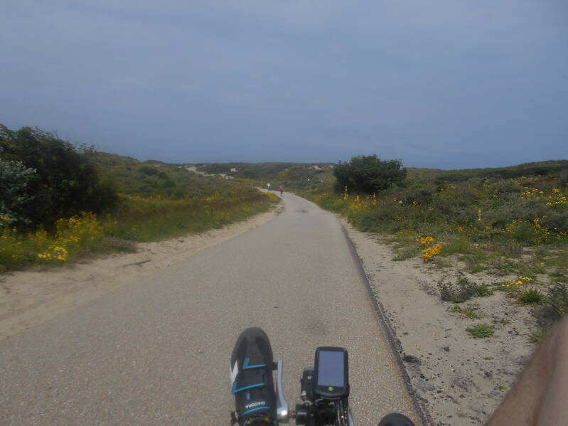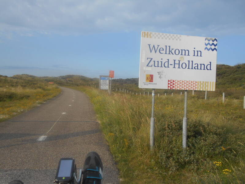 Zuidwaarts Noord Holland uit, en ik reed op een van mooiste fietspaden Nederland. Deze gaat ook op het lijstje. Wat klimmetjes, weinig bomen, prachtig om zo'n eind door de duinen te kunnen kijken. En ga het rijtje maar af Noordwijk, Katwijk, even toiletteren in een hok die daarvoor is bedoeld. Duitse kentekens die het toch aandurven. Een vriendelijke goedemorgen hier, een groet daar. Wassenaar waar overstekende duinen je het soms best lastig maakt. Als je de verkeerde hoop zand treft is er niets aan te houden. Gelukkig zonder schrammetje de route kunnen doen.
