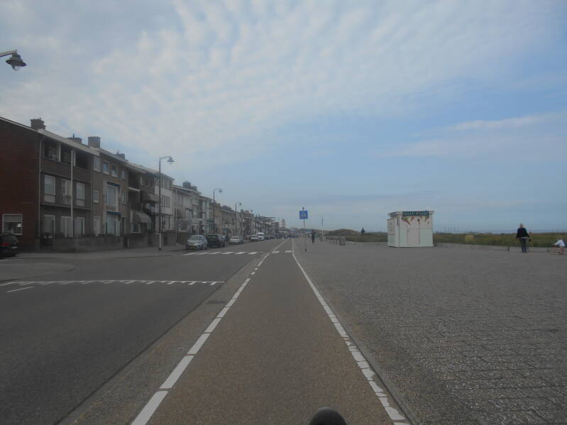 De niet zo harde wind had ik in de rug vandaag, dus schoot het mooi op. Ik was zo bij de watertoren van Den Haag. Ik was inmiddels toe aan pauze. Niet vanwege het zitten, het was in de trein goed vertoeven, maar sinds thuis had ik niets gegeten. Ik vond een mooi plekje bij de pier in Scheveningen vlak voor het hotel. Lekker mensen kijken. Jaren terug ben ik hier ook eens naar toe gereden van huis met de Sparta. Ik overnachtte toen in Zoetermeer. Daar begon het fietspad druk te worden. Blijkbaar hebben ze hier ook vakantie. Soms goed opletten wat er allemaal oversteekt.