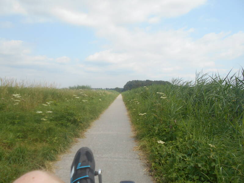 Bij Maassluis komt een nieuwsgierig stel naast me fietsen, vragen over wat ik aan de pet heb hangen, afkomst en doel. De Twentse tongval valt goed op blijkbaar.