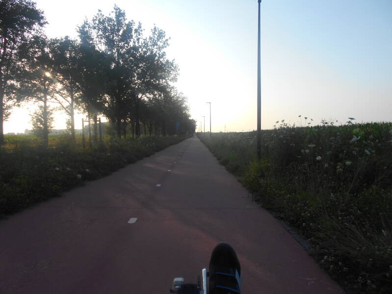 Bij Monster kun je mooi hoog langs de Noordzee fietsen. Mooi maar ook steile stukken hier. Niet veel later of ik nam afscheid van de zee bij Hoek van Holland. En fietste ik tussen de kassen door naar het oosten. Verleidelijk om naar Hellevoetsluis weer de dam over te gaan, maar deze route heb ik 2 jaar terug al eens gehad naar Vlissingen. Dus heb ik nu de Hoeksche waard ook in de route opgenomen.